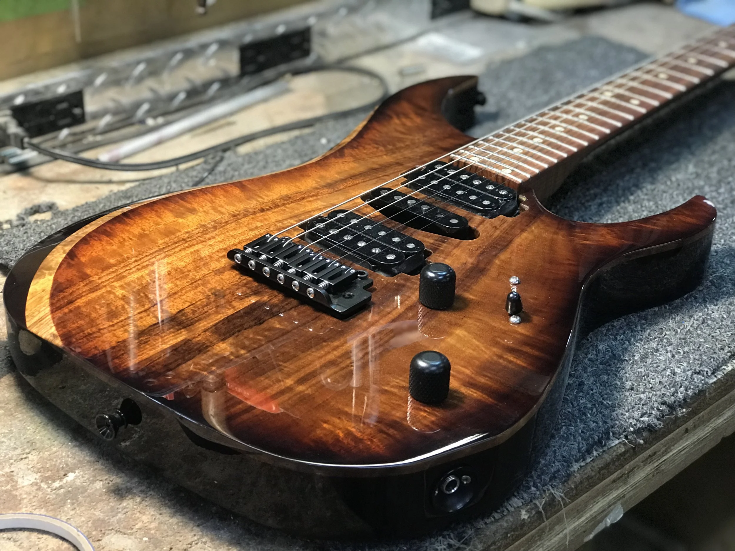 Following suit with quality we generally use nitrocellulose lacquer for the most resonance and historical accuracy. However we don’t only use nitro. For the models with no age we can also use polyurethane or polyester finishes to keep it nice and glossy even after its fair share of gigs. And on the subject of paint, what would a custom guitar be without a custom color? Since we do everything by hand we can basically make any color under the sun. Not only that but on models with more aging, you can even have multiple colors layered on top of each other for a vintage rub through look. The possibilities are endless, and we are far from done inventing new ones.